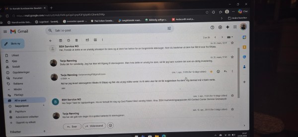 med støvsugeren vår der batteriet ikke lot seg lade opp. For fjorten dager siden, fikk jeg en epost der det sto at de hadde satt i gang arbeidet med å finne ut hva som var galt med batteriet som ikke lot seg lade opp. I fjorten dager har de holdt på, og jeg har ikke hørt noe mer, selv om de skrev at jeg kunne følge med på hva som skjedde. Og jeg sier: Kjære Bosch. Det går ikke an å behandle kunder på denne måten. Jeg kjøpte et nytt produkt som ikke fungerer, dere har fått det tilbake for å undersøke det. Nå har dere undersøkt produktet i fjorten dager, og ikke funnet ut noe. Fy fillern, dette er dårlig service.