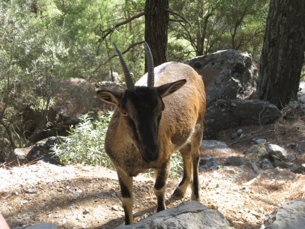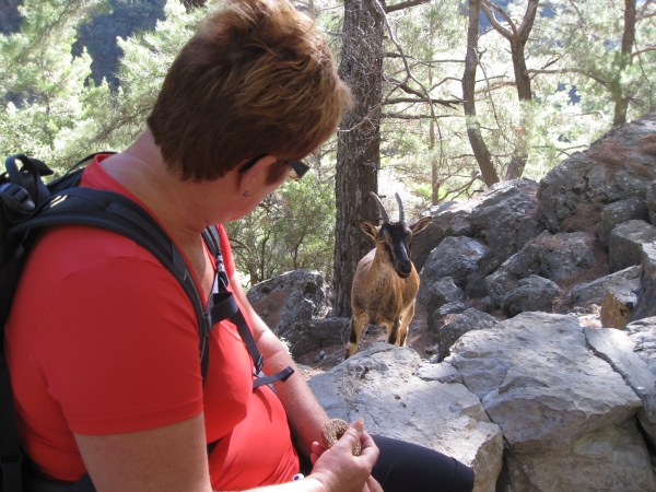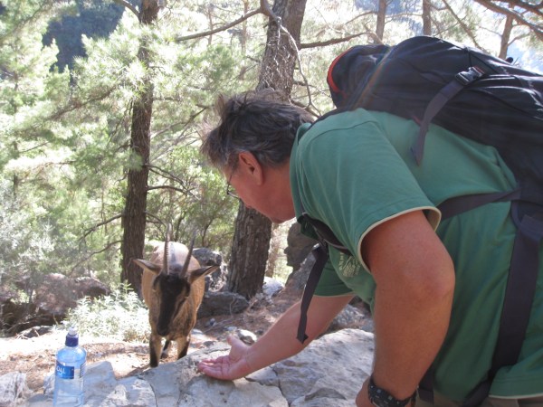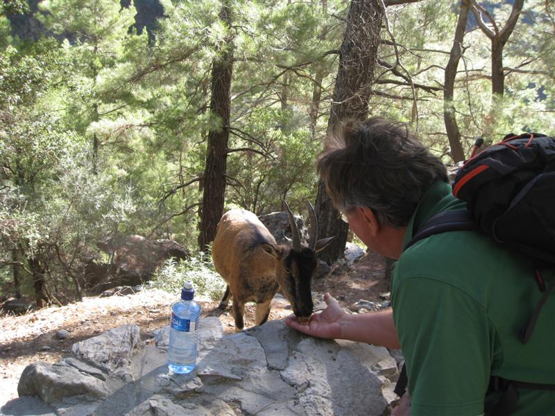 Et av stedene der vi stopper for en liten hvil, kjenner jeg noe som stryker lett over håndbaken min. Jeg sitter på en stein og støtter meg på hendene mine. Jeg snur meg og ser en liten geit fem centimeter fra hånden min. Jeg ber Inger Johanne bryte av en bit av baguetten og legger den på muren. Geita forsyner seg. En ny bit lar jeg ligge i hånden og jammen spiser geita rett fra hånden min. Dette er KRI-KRI, Kretas villgeit som blant annet lever i Samariaravinen.
