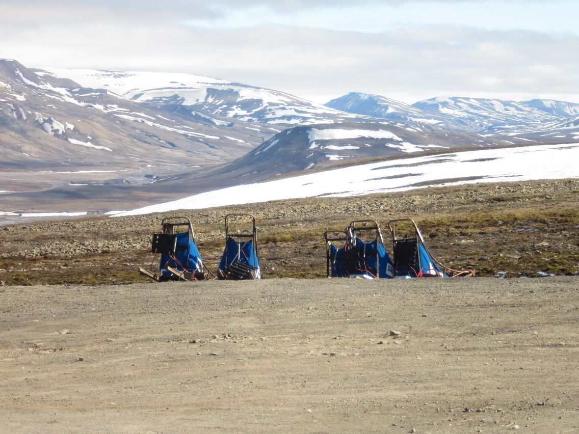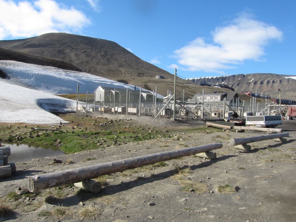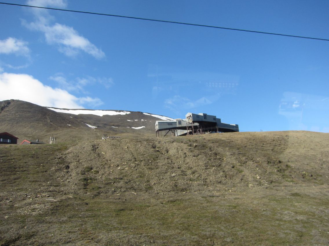Foran oss ser vi at veien begynner å stige oppover i svinger og vi følger denne veien inntil vi ser to digre skålantenner og noen rør og tanker. Skålantennene er EISCAT Svalbard Radar som ligger rett over Gruve Sju og rørene og tankene tilhører Gruve Sju. Skålene er digre med diametre på trettito og førtito meter. Vi parkerer et stykke fra anlegget siden det er ulovlig å bevege oss under skålene. Ved siden av der vi parkerer finner vi en haug med kull, lett og porøst, så porøst at det raskt går i stykker når vi klemmer på klumpene. Litt lenger nede i veien ser vi flere hundesleder som har blitt stående her oppe siden snøen gikk. Akkurat som snøscooterne som står henslengt overalt.