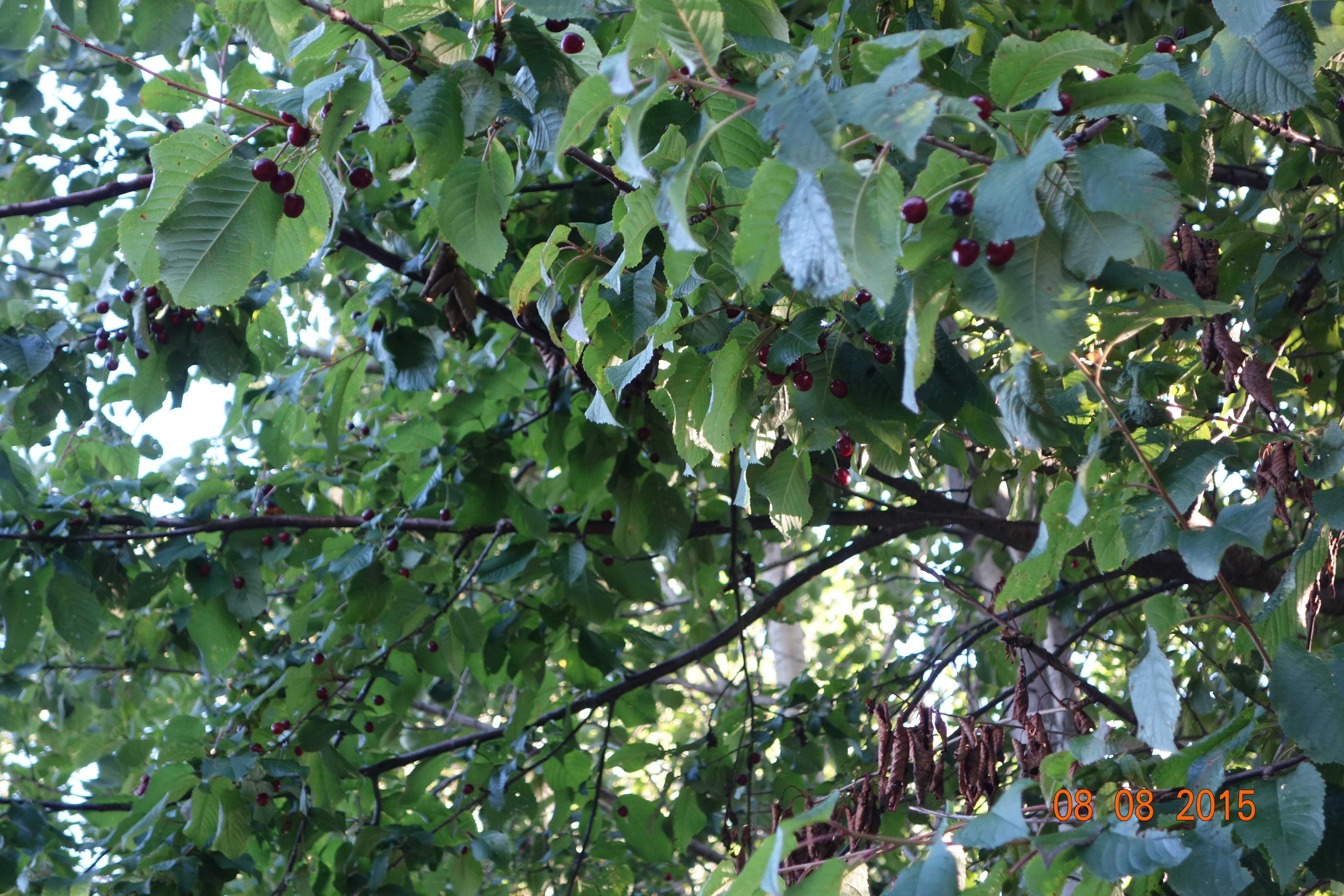 kirsebær. Kanskje det er moreller, men så har jeg lest meg til at det ikke er noe som heter moreller. Det heter altså søtkirsebær; har jeg da lest meg til. Uansett, disse bærene som vanligvis er svært populære blant småfuglene, har i år fått henge helt urørte. Ingen fugler har funnet disse søte kirsebærene interessante. Og det er ikke bare det.