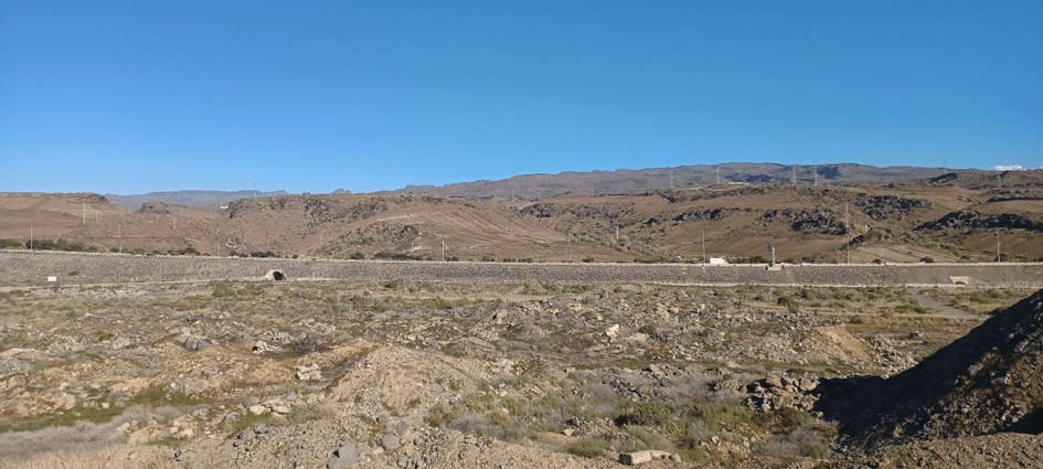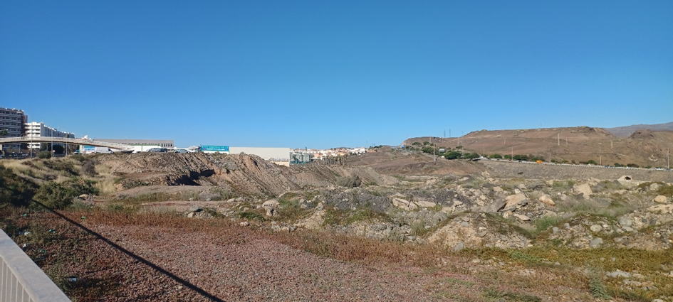 Her var det planlagt et stort vannland som ikke ble gjennomført.Her er Inger Johanne på vei langs carreteraen (riksveien).Utsikten mot autopistaen (motorveien) og fjellene bak. Der gikk vi mange turer da vi var sprekere.