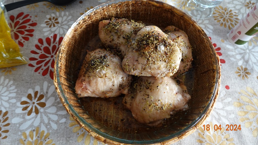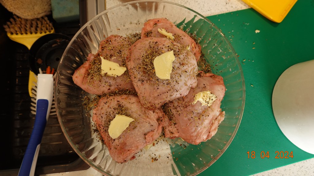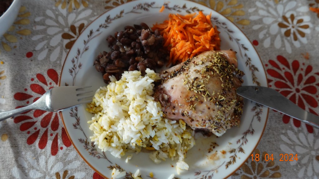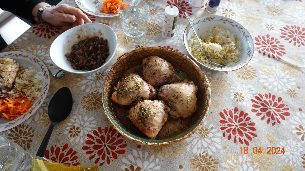 I dag ble det overlår av kylling med ris, brune bønner og raspede gulrøtter, alt med noe veiledning fra Inger Johanne underveis og oppskrifter fra internett. Desserten kom senere med en fruktgrøt av stikkelsbær, svisker og epler. Den sto Inger Johanne bak.