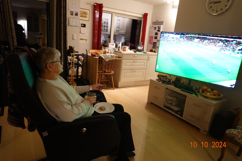 - På slutten av dagen var det fotball-kamp, også for meg som ikke har peiling på denne idretten. Etter operasjonen sliter Inger Johanne med hørselen, så hennes plassering ble første rad og nærmest tv-skjermen og fotball-spillerne.