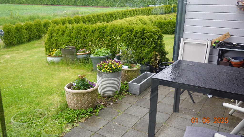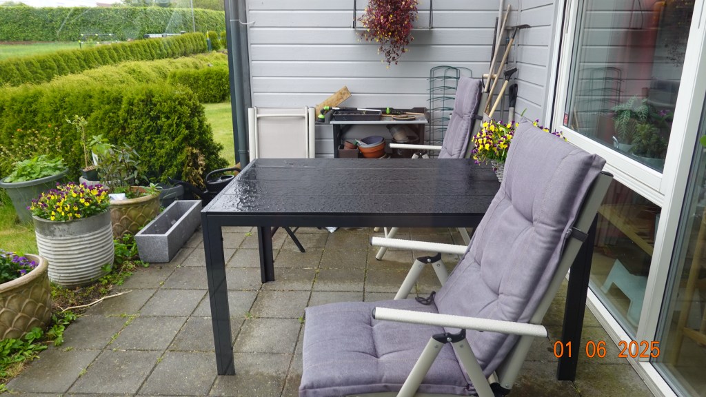Det er søndag og været i dag er varslet med regn, og det stemmer. Det regner ute. Å søren, der glemte jeg stolputene ute fra i går, men heldigvis, det har ikke regnet lenge, så de tørker inne i stua, lent opp mot stuestolene.
