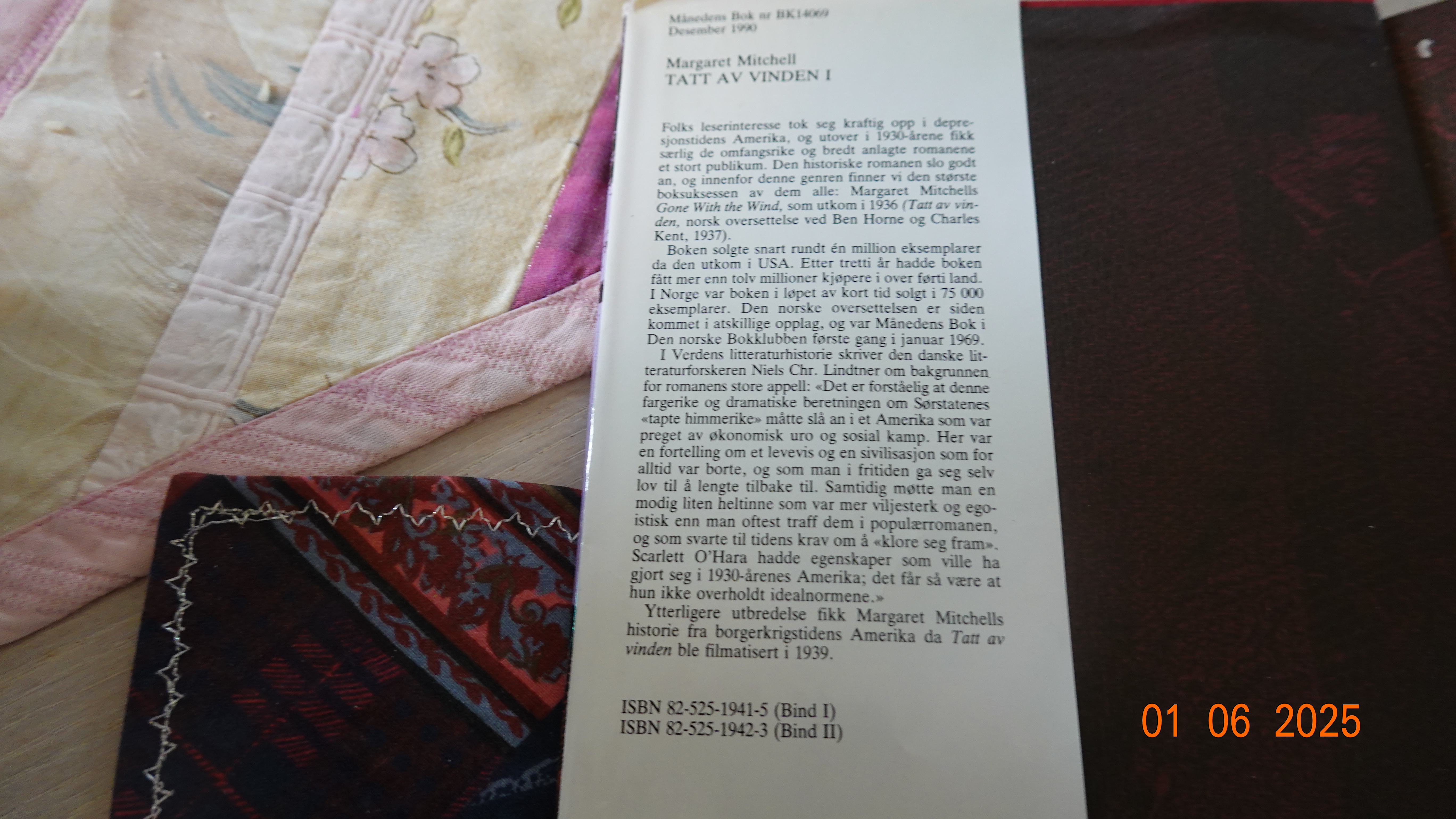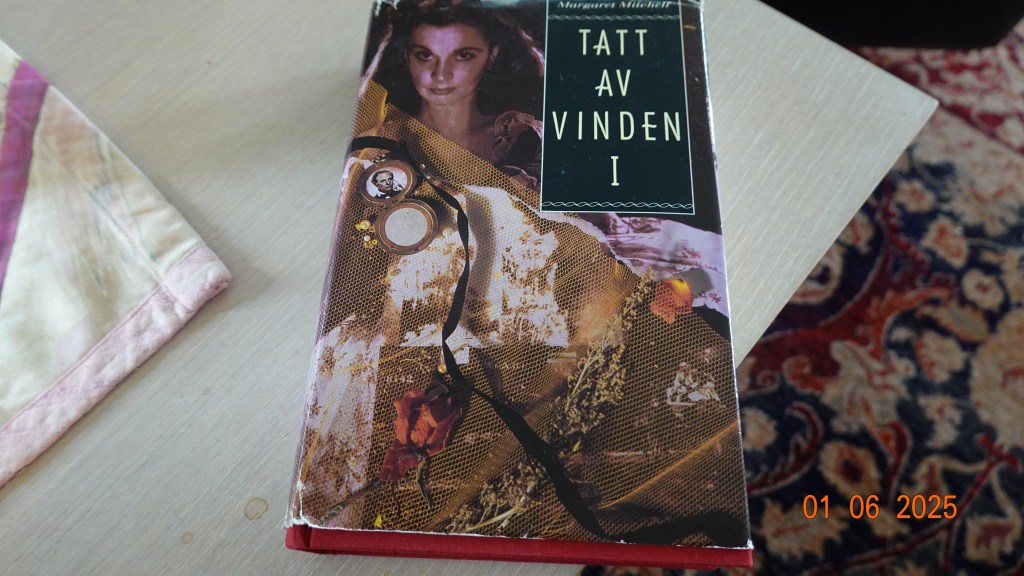 Nå har klokka blitt halv fire, jeg har lagt fra meg det første bindet av «Tatt av vinden» av Margaret Mitchell. Den er ferdig lest, og jeg tenker at det er jo dumt at forfatteren skrev bare denne boka og lot det bli med det, for hun har tydeligvis evnen til å skrive.