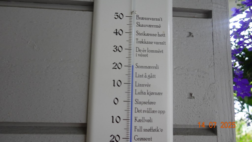 Tjueen grader klokka halv ni morgen. Dette er vel den varmeste dagen i sommer. Og sånn er det over hele landet etter det vi hører, og sammen med svak verdi på vår valuta trekker dette turister som synes at tjue grader er kjølig og at det meste er billig i Norge.