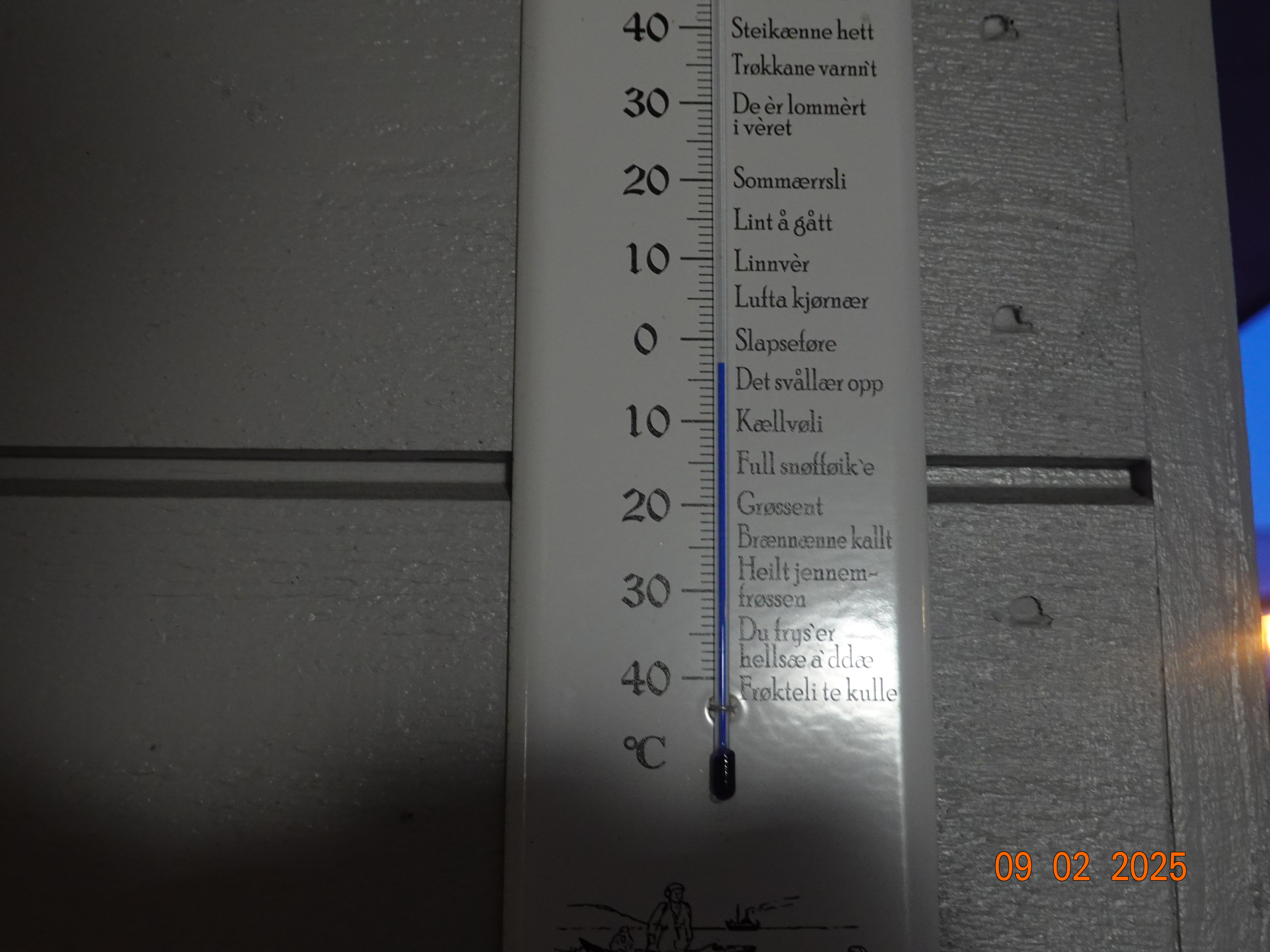 Det har gått en times tid. Klokka er nå halv åtte og dagen er i ferd med å ta over etter natten. Gradestokken viser tre minusgrader, og det stemmer nok med det meteorologene meldte i går. Høytrykk og noen få kuldegrader, meldte de.