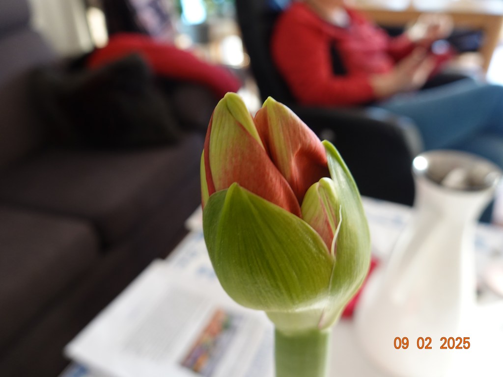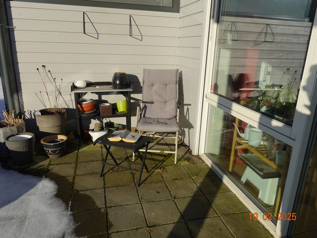 Sykehuset i Tønsberg. Inger Johanne venter på innkalling til å skru på pumpa i hodet.Og jeg tar noen bilder.Vi er hjemme igjen og møter katten til naboen.Sola skinnerog Inger Johanne hviler etter sykehusbesøketJeg har funnet meg en plass i solaNå springer snart blomsten ut.